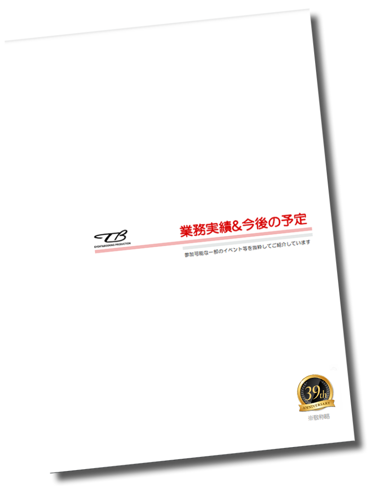業務内容-Business content- 各種出演者のブッキング業務各種出演者のキャスティング業務各種ステージショーの企画.制作.運営各種プロモーション業務各種イベントの企画.制作.運営各種出演者.文化人側との業務提携その他関連業務全般 各種出演者は勿論!音響.照明.設営.施工.レンタル.進行 運営 印刷物までまるごとお任せ頂けます。 業務実施例-Business example- コンサート ライブ ディナーショー 講演会 セミナー トークショー 自治体/企業イベント PRイベント インストアライブ キャンペーン CM 広告 映画 TVラジオ番組(公開番組含) 映像撮影/配信 学園祭 パッケージイベント など 業務アイテム-Business item- 各種タレント アーティスト 演奏家 文化人 講師スポーツ選手 お笑い ものまね 落語家 漫談家インフルエンサー YouTuber 声優 ダンサー 振付師各種団体 伝統芸能 大衆演劇 大道芸 パフォーマー マジシャン キャラクターショー 家族向け全般舞台監督 ディレクター MC 企画書 運営マニュアル台本 脚本 音響 照明 特効 各種レンタル 設営 施工 アルバイト など 会社概要-Corporate information- 商号株式会社タレントブッキング英字表記TALENT BOOKING INC.創業1988年08月08日(昭和63年)最終登記2005年09月20日 (有限から株式へ組織変更登記日)資本金1.000万円決算日12月31日金融機関浜松いわた信用金庫 駅南支店代表取締役安生和広所在地静岡県浜松市中央区上浅田1-3-27 光ビル2階 〒432-8042TEL(053)451-1773 FAX(053)451-1775tb@t-booking.co.jp 主な仕入れ先 芸能プロダクション※ほとんどの会社とお取引させて頂いてます制作会社及び営業会社個人で活動している各種出演者.講師.文化人の方々音響及び照明会社設営及びレンタル会社 主な取引先 放送局新聞社広告代理店イベント企画・制作会社CM・番組制作会社旅行代理店ホテルテーマパークショッピングセンター公営ギャンブル場自治体各会館及び会場各種企業労働組合教育関連団体学園祭実行委員会 業務実績&今後の予定-Business performance & future plans- 業務実績&今後の予定(PDFファイル)をダウンロードするには、下記ボタンをクリックして下さい。 業務実績&今後の予定 PDFファイルを利用するためにはあらかじめAdobe Acrobat Readerをダウンロードしインストールしていただく必要があります。 ※但し弊社ではAdobe Acrobat Readerのインストールによるトラブル 不具合に対しては、いかなる責任も負いません。 Instagram tale.boo ボートレース尼崎が熱い! サントムーン柿田川(静岡県) 森口博子NEWアルバム オリコン初登場5 イオンレイクタウン(埼玉県) ボートレース尼崎にて開催決定! #早 さらに読み込む Instagram でフォロー 公式SNS Social Media Network 公式Facebookページ 公式X(旧Twitter) 公式Instagram よくある質問 お問合せ